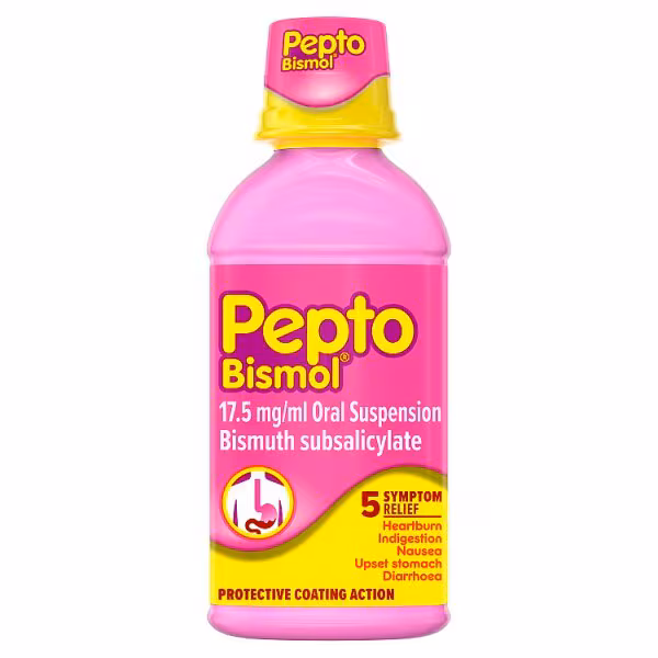 Pepto-Bismol® Oral Suspension provides fast, effective relief from common digestive discomforts, including upset stomach, nausea, heartburn, indigestion, gas, and diarrhoea. Its active ingredient, bismuth subsalicylate, works by soothing the stomach lining and helping control diarrhoea.